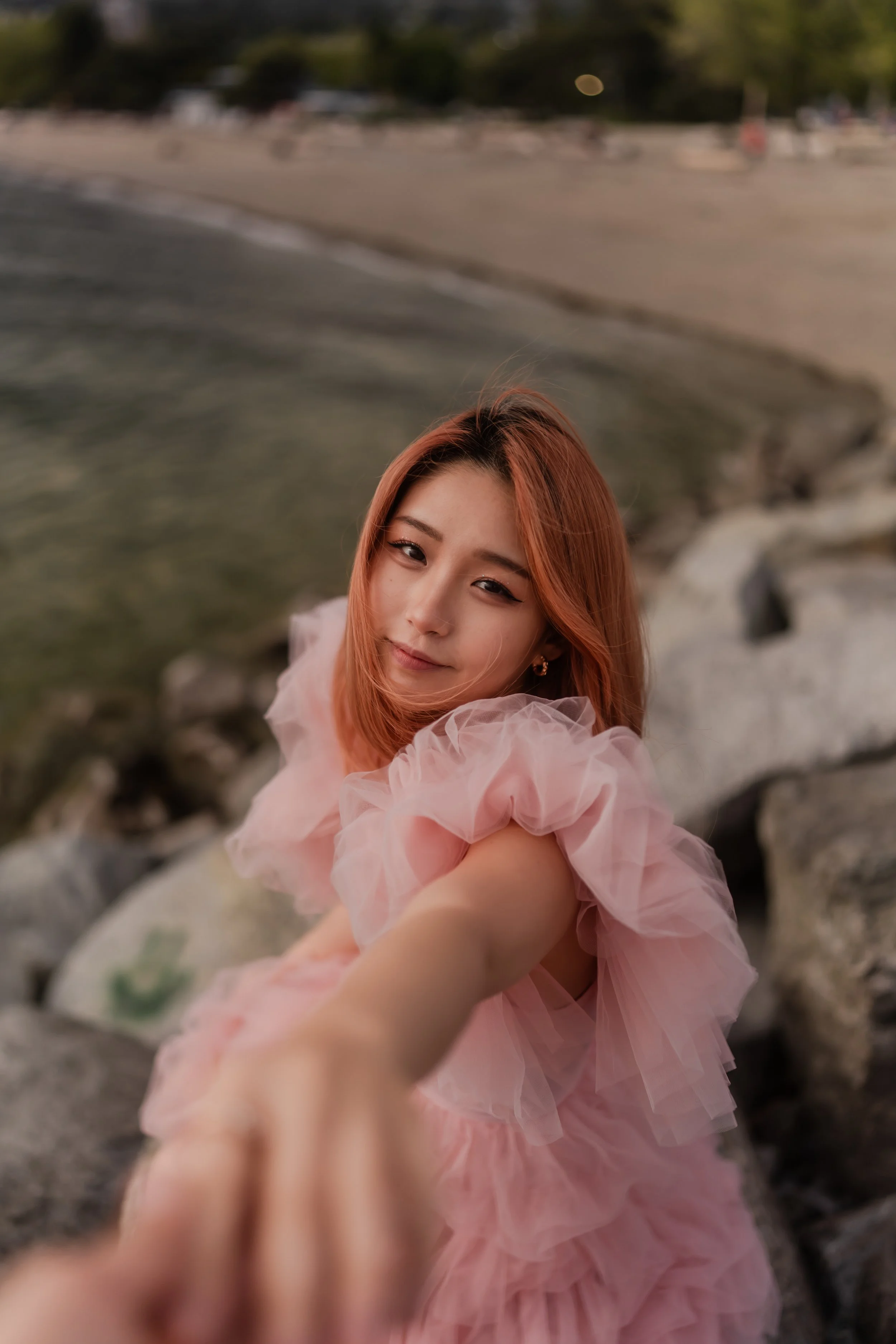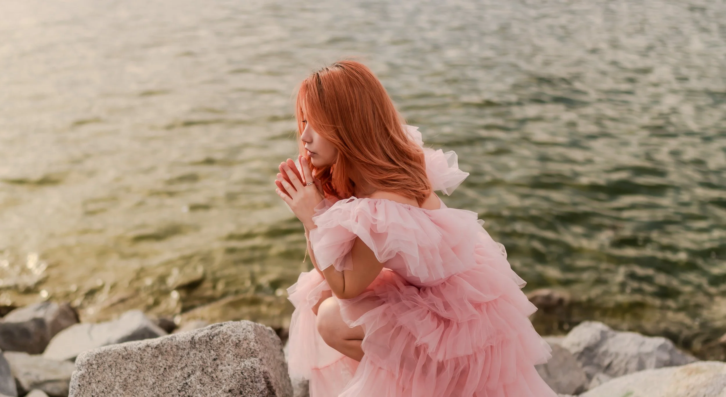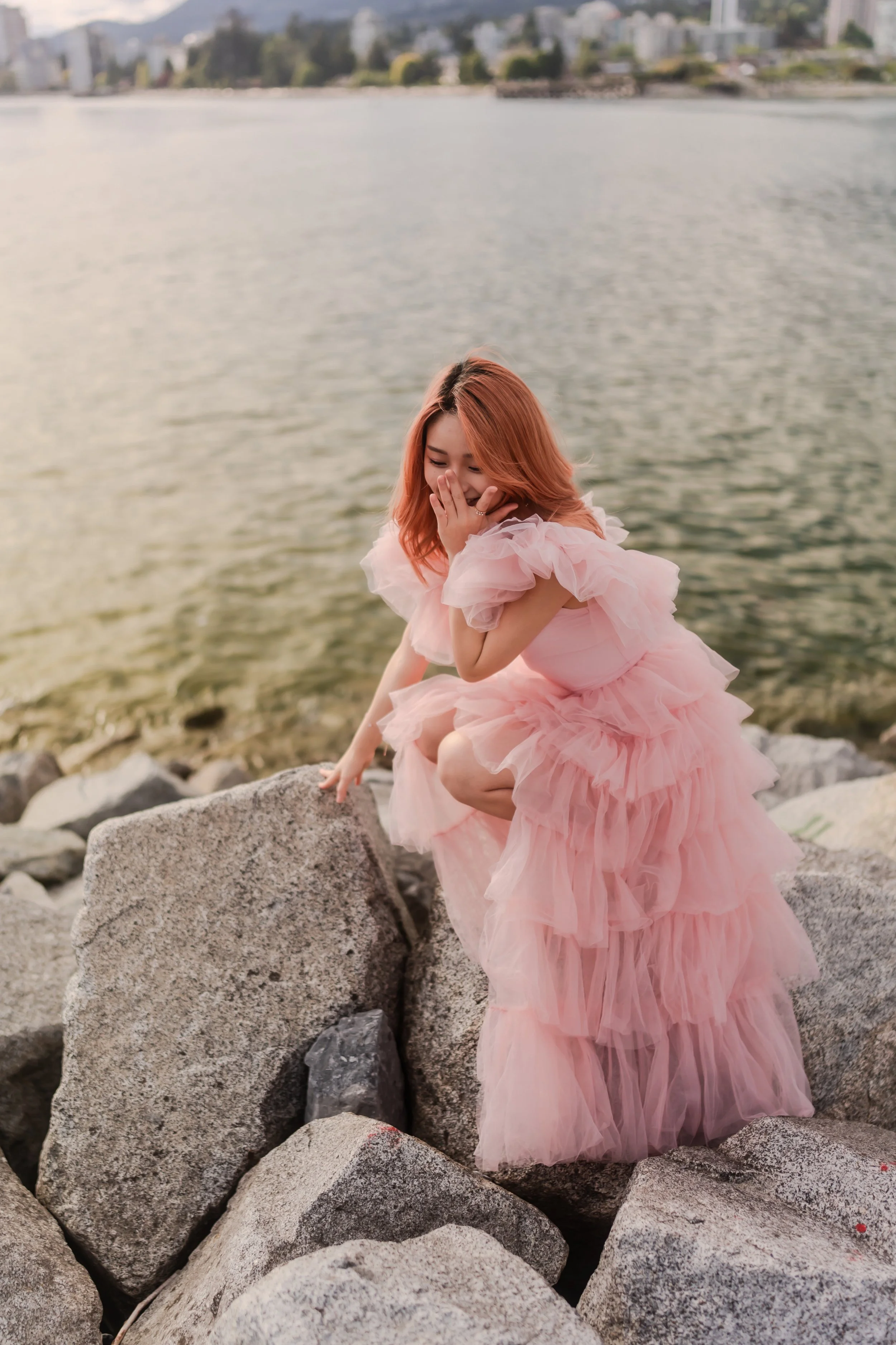 We wandered along the shore of West Vancouver, where the rocks met the sea, and beneath the moody sky, she wore a flowing pink dress. The clouds hung heavy, but the sun, a soft presence behind them, peeked through in gentle bursts, casting a diffused, ethereal light across everything. The glow created a halo effect, softly illuminating the scene as if nature itself was painting the moment. The atmosphere felt timeless, like a perfect blend of tranquility and fleeting beauty.